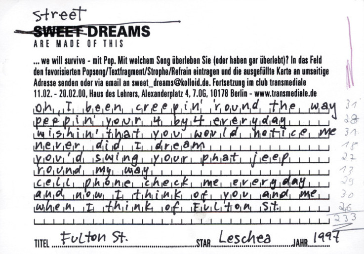 »(…) Menschen, die wir mögen, nehmen wir manchmal Kassetten auf. Warum? Vielleicht, um sie zu überzeugen, aber eigentlich tun wir es doch nur, weil wir verstanden werden wollen.«[1] Als Spiegel der eigenen Stimmungslage oder als Vermutung über die seelische Befindlichkeit des anderen, ist eine Mix-Kassette Element einer Kommunikation, die ohne eigene Worte und Töne auskommt. Das Eigene, die Botschaft vermittelt sich durch die Auswahl und die einzigartige Verkettung der verschiedenen Stücke. Auf solchen Tapes tritt die persönliche Vereinnahmung und die identitätsstiftende Bedeutung von Stücken diverser Pop-Genres zutage.