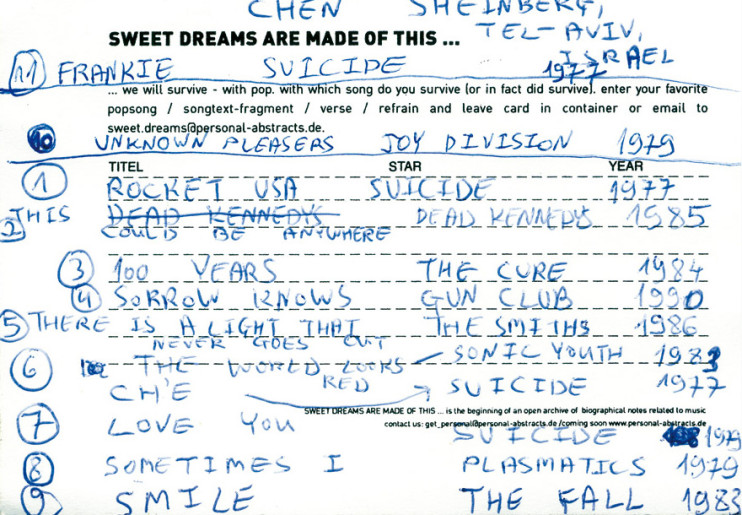 Das Projekt »Sweet Dreams are made of this« von Jan Rohlf und Maverick widmet sich der individuellen, privaten Auseinandersetzung mit Musik. Kernelement ist eine Plattform, die unter dem Titel „Personal Abstracts“ Einzelnen die Möglichkeit bietet, einem Publikum die eigene Musiksammlung vorzuspielen und ihr Zustandekommen zu erklären. Speziell gefertigtes, modulartiges Mobilar soll die Vorstellenden zu einer ausführlichen Präsentation bewegen und ein konsumorientiertes, unkonzentriertes Verhalten der Zuhörer verhindern. So wird der Raum zu einem Ort der Aufmerksamkeit und des Zuhörens, innerhalb dessen man aus der Privatheit heraustreten und die Verflechtung von Biographie und verschiedensten Musikströmungen transparent machen kann.